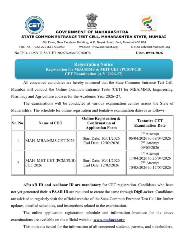 Registration Notice - Registration for MBA-MMS CET Exam 2026