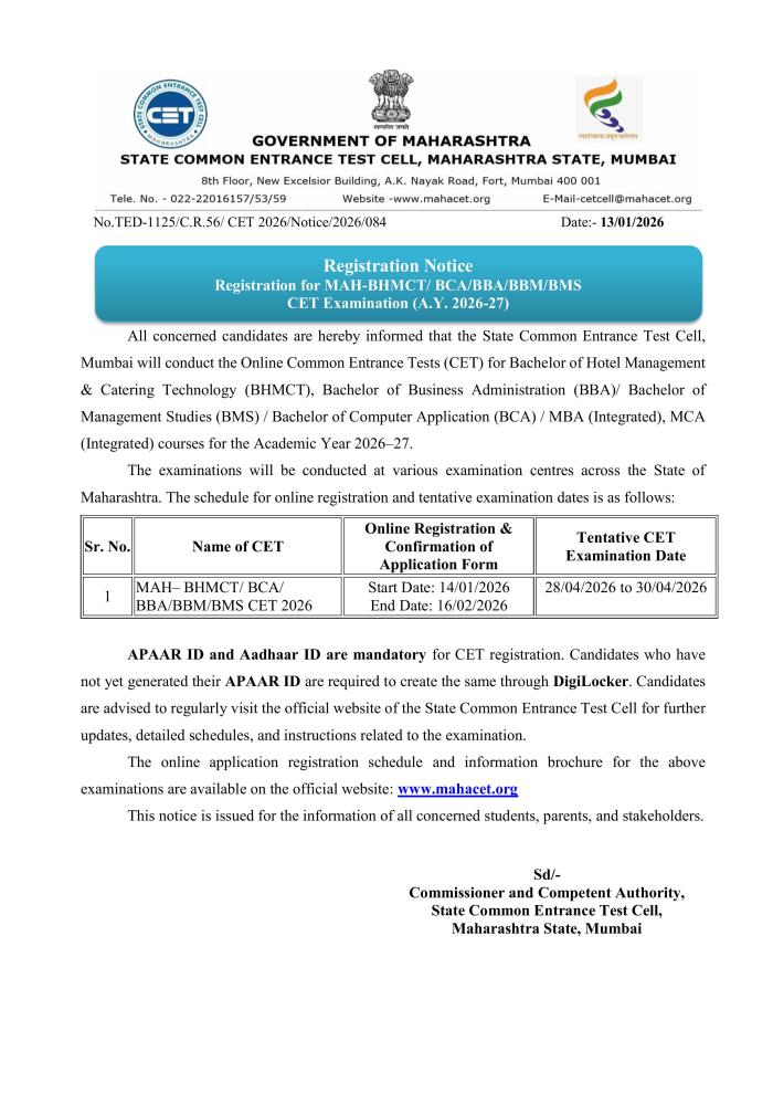 Registration Notice Registration for MAH-BHMCT-BCA-BBA-BBM-BMS-CET-Exam-A-Y-2026-27